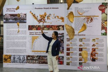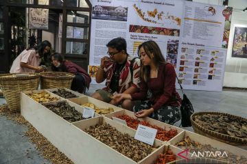 Pengunjung mengamati rempah nusantara yang dipajang dalam pameran seni US bertajuk Semarang Bercerita di Gedung Oudetrap Kota Lama, Semarang, Jawa Tengah, Sabtu (2/12/2023). Pameran yang diadakan oleh Dinas Kebudayaan dan Pariwisata setempat dengan tema Jejak Jalur Rempah Kota Semarang tersebut menampilkan berbagai macam jenis karya seni dari puluhan seniman lokal yang berlangsung hingga 10 Desember 2023. ANTARA FOTO/Makna Zaezar/YU