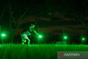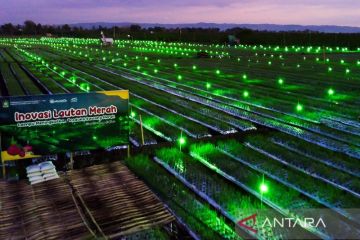 Penggunaan lampu hijau di pertanian bawang merah. Suasana lahan pertanian bawang merah yang disinari lampu hijau di Tegaldelimo, Bayuwangi, Jawa Timur, Senin (4/12/2023). Kelompok tani Joyo memanfaatkan lampu hijau yang dinamai Inovasi Lautan Merah (lampu meningkatkan produksi bawang merah) dengan energi listrik PLN sebagai penangkal hama yang dinilai sudah terbukti mampu meningkatkan hasil produksi dari 12 ton menjadi 16 ton per hektar serta menurunkan penggunaan pestisida hingga 70 persen. ANTARA FOTO/Budi Candra Setya/Spt.