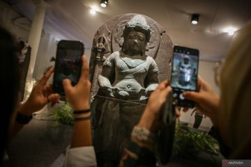 Sejumlah pengunjung memotret Arca Nandiswara dalam pameran Repatriasi di Galeri Nasional, Jakarta, Selasa (5/12/2023). Pameran yang memamerkan 152 benda bersejarah itu diselenggarakan oleh Galeri Nasional Indonesia bersama Museum Nasional Indonesia, Museum dan Cagar Budaya, serta Kementerian Pendidikan, Kebudayaan, Riset dan Teknologi dan berlangsung hingga 10 Desember 2023. ANTARA FOTO/Erlangga Bregas Prakoso/foc.