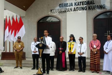 Presiden Joko Widodo (kiri) menghadiri peresmian Gereja Katedral Kristus Raja Kupang, NTT, Rabu (6/12/2023). Presiden Jokowi berharap dengan peresmian rumah ibadah dengan kapasitas 1.500 orang jemaat tersebut dapat menjadi ruang dialog untuk mempererat persatuan dan kesatuan bangsa. ANTARA FOTO/Mega Tokan/foc.