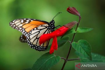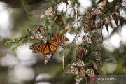 Kupu-kupu raja hinggap di atas bunga di kawasan cagar alam kupu-kupu Sierra Chincua di Angangeo, negara bagian Michoacan, Meksiko , Kamis (7/12/2023). Jutaan kupu-kupu langka tersebut biasanya bermigrasi setiap tahun hingga 2.000 mil (3.000 km) dari Amerika Serikat bagian timur dan Kanada untuk menghabiskan musim dingin dalam hutan di Meksiko tengah dan barat. ANTARA FOTO/Reuters/Raquel Cunha/nym.