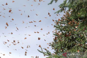Kupu-kupu raja terbang di kawasan cagar alam kupu-kupu Sierra Chincua di Angangeo, negara bagian Michoacan, Meksiko , Kamis (7/12/2023). Jutaan kupu-kupu langka tersebut biasanya bermigrasi setiap tahun hingga 2.000 mil (3.000 km) dari Amerika Serikat bagian timur dan Kanada untuk menghabiskan musim dingin dalam hutan di Meksiko tengah dan barat. ANTARA FOTO/Reuters/Raquel Cunha/nym.
