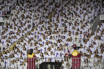 Sejumlah jemaat berdoa pada perayaan Natal Gereja Tiberias Indonesia di Stadion Utama Gelora Bung Karno, Senanyan, Jakarta, Sabtu (9/12/2023). Perayaan Natal Gereja Tiberias yang digelar setiap Sabtu pekan pertama Desember tersebut dihadiri lebih dari 200 ribu jemaat. ANTARA FOTO/Hafidz Mubarak A/aww.