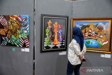 Pengunjung mengamati karya lukisan dalam pameran seni rupa Aku Akan Memilih di Gedung Karesidenan eks Bakorwil BKPP, Kota Bogor, Jawa Barat, Senin (11/12/2023). Pameran yang berlangsung hingga 18 Desember 2023 tersebut menampilkan 26 karya lukisan dari 25 perupa dan 13 karya digital mahasiswa Psikologi Persepsi Sekolah Tinggi Desain Interstudi Jakarta untuk mengedukasi masyarakat khususnya generasi Z agar lebih memahami tentang demokrasi. ANTARA FOTO/Arif Firmansyah/nym.