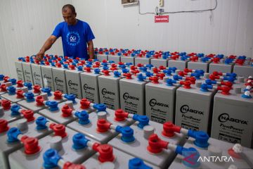 Petugas memeriksa baterai panel Pembangkit Listrik Tenaga Surya (PLTS) Pulau Mecan, Batam, Kepulauan Riau, Selasa (12/12/2023). PLTS berkapasitas 15 kWp bantuan Kementerian Energi dan Sumber Daya Mineral (ESDM) itu untuk memenuhi kebutuhan listrik rumah tangga serta fasilitas umum seperti puskesmas dan masjid. ANTARA FOTO/Teguh Prihatna/aww.