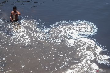 Warga menggunakan perahu melintasi Sungai Bengawan Solo yang tercemar limbah alkohol dan tekstil di dekat Instalasi Pengolahan Air (IPA) Stasiun Jurug Solo, Jawa Tengah, Minggu (17/11/2023). Pencemaran limbah industri terhadap air baku dari Sungai Bengawan Solo tersebut mengakibatkan terganggunya operasional produksi air minum oleh Perusahaan Daerah Air Minum (PDAM) Toya Wening Surakarta sehingga tidak memenuhi baku mutu persyaratan kualitas air minum. ANTARAFOTO/Maulana Surya/foc.