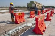 Pekerja mengisi air pada "water barrier" atau pembatas jalan di jalur fungsional Tol Solo-Yogyakarta di Boyolali, Jawa Tengah, Kamis (21/12/2023). Pemasangan rambu pembatas jalan tersebut bertujuan untuk memberikan kenyamanan dan keselamatan bagi pengemudi yang melintas di jalur fungsional Tol Solo-Yogyakarta yang akan dibuka pada Jumat (22/12) saat arus mudik liburan Natal 2023. ANTARA FOTO/Aloysius Jarot Nugroho/aww.