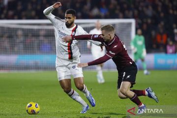Pemain AC Milan Ruben Loftus-Cheek berebut bola dengan pemain Salernitana Mateusz Legowski dalam laga lanjutan Liga Italia di Stadio Arechi, Salerno, Italia, Sabtu (23/12/2023). AC Milan menahan imbang tuan rumah Salernitana dengan skor 2-2. ANTARA FOTO/Reuters/Ciro De Luca/nym.