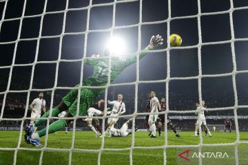 Pemain Salernitana Federico Fazio menendang bola ke gawang AC Milan yang dijaga Mike Maignan dalam laga lanjutan Liga Italia di Stadio Arechi, Salerno, Italia, Sabtu (23/12/2023). AC Milan menahan imbang tuan rumah Salernitana dengan skor 2-2. ANTARA FOTO/Reuters/Ciro De Luca/nym.