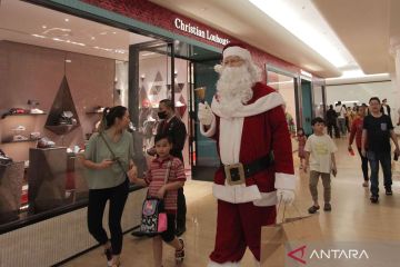 Sinterklas berkeliling membagikan hadiah kepada pengunjung di salah satu pusat perbelanjaan, Jakarta, Senin (25/12/2023). Sebagian warga Ibu Kota mengisi liburan akhir tahun dengan mengunjungi sejumlah pusat perbelanjaan dan mal yang didekorasi dengan nuansa Natal 2023 dan Tahun Baru 2024. ANTARA FOTO/Reno Esnir/YU