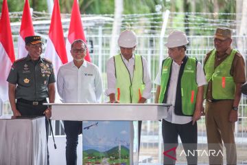 Presiden Joko Widodo (tengah) didampingi Menkominfo Budi Arie Setiadi (kedua kanan), Mendag Zulkifli Hasan (kedua kiri), Panglima TNI Jendral TNI Agus Subiyanto (kiri), dan Gubernur Sulawesi Utara Olly Dondokambey (kanan) saat meresmikan Proyek Base Transceiver Station (BTS) 4G dan pengoperasian Stasiun Bumi Satelit Republik Indonesia (SATRIA)-1 di Desa Bowombaru Utara, Melonguane Timur, Kabupaten Kepulauan Talaud, Sulawesi Utara, Kamis (28/12/2023). Kemenkominfo mengoperasikan Satelit Bumi Satria-1 serta 4.990 BTS 4G yang telah rampung dibangun BAKTI Kominfo di daerah tertinggal, terdepan, terluar (3T), hal tersebut merupakan upaya pemerintah mempercepat pemerataan konektivitas digital dengan membangun infrastruktur digital. ANTARA FOTO/Yulius Satria Wijaya/Spt.