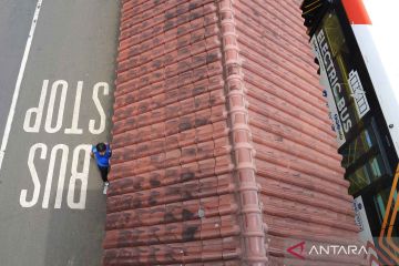 Pengendara sepeda melaju di samping bus listrik Transjakarta di halte bus Universitas Indonesia, Depok, Jawa Barat, Minggu (31/12/2023). Penggunaan bus berbasis listrik itu menjadi salah satu langkah nyata untuk mencapai net zero emisi serta mewujudkan transportasi umum yang bertanggung jawab terhadap aspek lingkungan dan sosial yang berkelanjutan. ANTARA FOTO/Andika Wahyu/YU