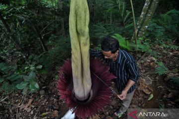 Seorang anak mengamati bunga Amorphophallus Titanum yang mekar sempurna di Taman Konservasi Puspa Langka, Kabupaten Kepahiang, Bengkulu, Senin (1/1/2024). Bunga Amorphophallus attua yang dikenal bunga bangkai tersebut memiliki tinggi 140 cm dan memiliki diameter sebesar 90 cm. ANTARA FOTO/Muhammad Izfaldi/aww.