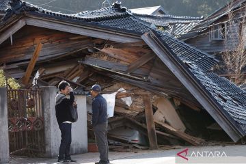 Warga berdiri di depan rumah yang runtuh akibat gempa bumi, di Nanao, prefektur Ishikawa, Jepang (2/1/2024). Gempa dahsyat berkekuatan magnitudo 7,6 mengguncang Semenanjung Noto di Prefektur Ishikawa, Jepang, pada hari pertama tahun 2024. ANTARA FOTO/REUTES/Kim Kyung-Hoon/aww.