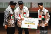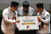 Menteri Agama Yaqut Cholil Qoumas (tengah) secara simbolis menyerahkan bantuan untuk warga Palestina melalui perwakilan Lembaga Zakat Infaq dan Shadaqah Muhamadiyah (Lazismu) dan Lembaga Amil Zakat Infaq dan Shadaqah Nahdlatul Ulama (Lazisnu) saat acara Untaian Doa dan Puisi Untuk Palestina di Gedung Pusat Perfilman H. Usmar Ismail, Jakarta, Selasa (2/1/2024). Kemenag memberikan bantuan untuk warga Palestina yang dananya berasal dari seluruh Aparatur Sipil Negara (ASN) Kemenag di seluruh Indonesia senilai Rp41,52 miliar. ANTARA FOTO/Aditya Pradana Putra/YU