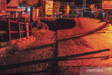 Warga berjalan melintasi jembatan yang ambruk di Tamiai, Kerinci, Jambi, Selasa (2/1/2024). Jembatan yang berada di jalan nasional itu menghubungkan Jambi dengan Sumatera Barat via Kerinci, ambruk sedalam satu meter lebih akibat tergerus banjir sehingga tidak bisa dilewati kendaraan. ANTARA FOTO/Wahdi Septiawan/YU