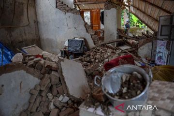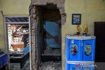 Kondisi rumah yang mengalami kerusakan akibat gempa di Cipameungpeuk, Kabupaten Sumedang, Jawa Barat, Rabu (3/1/2024). Pemerintah Kabupaten Sumedang mencatat sebanyak 1.004 unit rumah warga mengalami kerusakan akibat gempa dengan magnitudo 4,8 pada Minggu (31/12/2023) dan hingga saat ini BPBD akan segera melakukan verifikasi untuk menentukan kategori kerusakan dari rusak berat hingga ringan. ANTARA FOTO/Raisan Al Farisi/YU