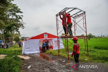 Petugas menyiapkan infrastruktur kelistrikan bagi warga pengungsi di Babakan Hurip, Kabupaten Sumedang, Jawa Barat, Rabu (3/1/2024). Pemerintah Kabupaten Sumedang menetapkan status tanggap darurat bencana gempa bumi sejak 1 Januari hingga 7 Januari 2024 dengan memfokuskan penanganan bagi masyarakat yang terdampak. ANTARA FOTO/Raisan Al Farisi/YU