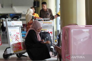 Sejumlah penumpang menunggu jadwal penerbangan di Bandara Internasional Minangkabau, Padang Pariaman, Sumatera Barat, Jumat (5/1/2024). PT Angkasa Pura II Bandara Internasional Minangkabau (BIM) menutup sementara aktivitas penerbangan di bandara tersebut akibat terdampak abu vulkanik erupsi Gunung Marapi. ANTARA FOTO/Muhammad Arif Pribadi/nym.