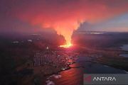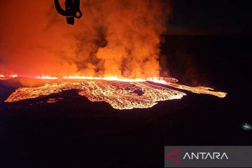 Sebuah gunung berapi meletus dengan memuntahkan lava di Semenanjung Reykjanes, Islandia (14/1/2024). Letusan gunung berapi di barat daya Islandia tersebut merupakan yang kedua kalinya dalam waktu kurang dari satu bulan. ANTARA FOTO/Iceland Civil Protection/Handout via REUTERS/tom.