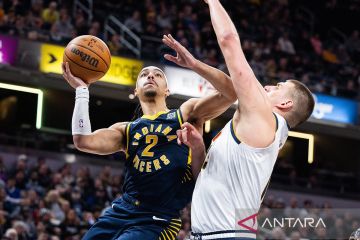 Pebasket Denver Nuggets Nikola Jokic (15) menggiring bola sementara pebasket Indiana Pacers Myles Turner (33) bertahan pada babak pertama di Gainbridge Fieldhouse, Indianapolis, Indiana, AS, Rabu (14/1/2024). Denver Nuggets mengalahkan Indiana Pacers dengan skor 114-109. ANTARA FOTO/Trevor Ruszkowski/USA TODAY Sports/Reuters/Spt.