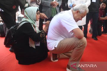 Calon presiden nomor urut 3 Ganjar Pranowo (kanan) berjongkok saat seorang guru ngaji perwakilan masyarakat menuliskan harapan di punggungnya dalam kampanye terbuka bertajuk Hajatan Rakyat di Stadion Bima, Cirebon, Jawa Barat, Sabtu (27/1/2024). Dalam kampanye tersebut, Ganjar mengatakan pasangan Ganjar-Mahfud akan mengedepankan integritas karena jabatan itu tidak untuk selama-lamanya namun ada batasnya. ANTARA FOTO/Akbar Nugroho Gumay/pras.