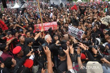 Calon presiden nomor urut 3 Ganjar Pranowo (tengah) bernyanyi dengan pendukungnya saat mengikuti kampanye terbuka bertajuk Hajatan Rakyat di Stadion Bima, Cirebon, Jawa Barat, Sabtu (27/1/2024). Dalam kampanye tersebut, Ganjar mengatakan pasangan Ganjar-Mahfud akan mengedepankan integritas karena jabatan itu tidak untuk selama-lamanya namun ada batasnya. ANTARA FOTO/Akbar Nugroho Gumay/pras.