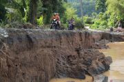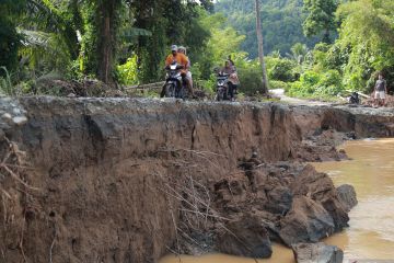 Dua pengendara sepeda motor melintas di samping jalan yang amblas akibat meluapnya sungai di Desa Sayoang, Pulau Bacan, Kabupaten Halmahera Selatan, Maluku Utara, Senin (29/1/2024). Jalan penghubung tiga desa di Kecamatan Bacan Barat itu amblas karena diterjang banjir akibat hujan deras sehingga mengganggu mobilitas warga dan membahayakan keselamatan. ANTARA FOTO/Andri Saputra/foc.