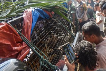 Sejumlah warga menyaklsikan seekor harimau sumatera (Panthera tigris sumatrae) yang berada di dalam kandang perangkap di desa Lawe Buluh Didi, kecamatan Kluet Timur, Kabupaten Aceh Selatan. Aceh, Jumat (2/2/2024). Balai Konservasi Sumber Daya Alam (BKSDA) Aceh mengevakuasi harimau tersebut ke kantor Balai Taman Nasional Gunung Leuser (BTNGL) Tapaktuan, Aceh Selatan untuk dilakukan pemeriksaan kesehatan sebelum dilepas liarkan kembali ke habitatnya. ANTARA FOTO/Istafan Najmi/foc.