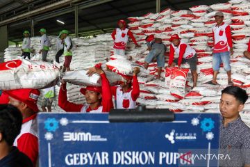 Pekerja membantu warga yang membeli pupuk pada acara gebyar diskon pupuk nonsubsidi di Banyuwangi, Jawa Timur, Sabtu (3/2/2024). Pemerintah melalui Pupuk Indonesia menggelar gebyar diskon hingga 40 persen pupuk nonsubsidi sebanyak 5.000 paket untuk memastikan pemenuhan kebutuhan pupuk bagi petani sekaligus mendukung Program percepatan musim tanam pada awal tahun 2024. ANTARA FOTO/Budi Candra Setya/YU