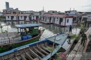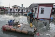 Warga membersihkan sungai di depan rumah apung di Blok Empang, Kecamatan Penjaringan, Jakarta, Senin (5/2/2024). Kementerian Pertahanan (Kemhan) bersama Universitas Pertahanan membangun enam unit rumah apung, 12 rumah panggung untuk 18 Kepala Keluarga atau 80 jiwa dan penataan ruang terbuka hijau serta fasilitas umum seperti desalinasi mengubah air laut menjadi air tawar yang dapat digunakan masyarakat setempat. ANTARA FOTO/Bayu Pratama S/Spt.