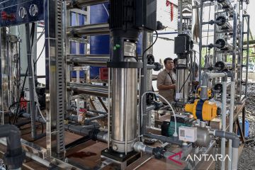 Petugas memeriksa peralatan desalinasi di Blok Empang, Kecamatan Penjaringan, Jakarta, Senin (5/2/2024). Kementerian Pertahanan (Kemhan) bersama Universitas Pertahanan membangun enam unit rumah apung, 12 rumah panggung untuk 18 Kepala Keluarga atau 80 jiwa dan penataan ruang terbuka hijau serta fasilitas umum seperti Desalinasi mengubah air laut menjadi air tawar yang dapat digunakan masyarakat setempat. ANTARA FOTO/Bayu Pratama S/Spt.