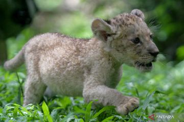 Bayi singa putih (Panthera leo) bernama Fano bermain di Taman Safari Prigen, Pasuruan, Jawa Timur, Kamis (8/2/2024). Singa putih yang lahir dengan berat 1,5 Kg dari indukan betina bernama Felisa dan pejantan bernama Debo tersebut menambah koleksi singa putih di taman itu menjadi 15 ekor. ANTARA FOTO/Umarul Faruq/foc.