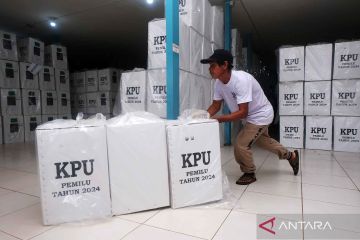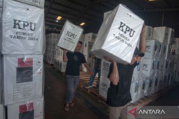 Pekerja mengangkat logistik Pemilu 2024 saat pendistribusian di gudang logistik KPU Kabupaten Kapuas Hulu, Kalimantan Barat, Jumat (9/2/2024). Komisi Pemilihan Umum (KPU) Kabupaten Kapuas Hulu mulai 8 hingga 11 Pebruari 2024 mendistribusikan logistik Pemilu yaitu 4.920 kotak suara untuk 984 Tempat Pemungutan Suara (TPS) di 23 kecamatan di wilayah setempat. ANTARA FOTO/Jessica Wuysang/YU