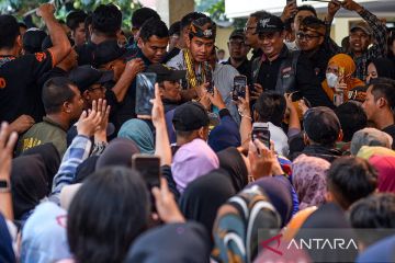 Calon wakil presiden nomor urut 2 Gibran Rakabuming Raka menyapa warga saat melakukan kampanye di kediaman Umuh Muchtar di Tanjungsari, Kabupaten Sumedang, Jawa Barat, Jumat (9/2/2024). Dalam kampanyenya itu Gibran Rakabuming Raka berdialog dengan warga serta bertemu dengan budayawan Sunda. ANTARA FOTO/Raisan Al Farisi/Spt.