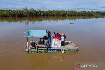 Petugas pemungutan Kecamatan (PPK) membawa logistik Pemilu menggunakan perahu pincara ke Desa Muara Sampara, Konawe, Sulawesi Tenggara, Senin (12/2/2024). Perahu pincara menjadi satu-satunya sarana pendistribusian logistik pemilu ke wilayah yang memiliki DPT sebanyak 358 orang tersebut. ANTARA FOTO/Andry Denisah/YU