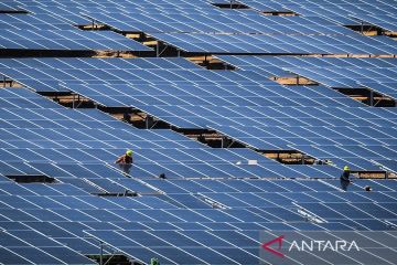 Pekerja menyelesaikan pembangunan Pembangkit Listrik Tenaga Surya (PLTS) untuk Ibu Kota Negara (IKN) Nusantara di Penajam Paser Utara, Kalimantan Timur, Kamis (15/2/2024). Pembangunan PLTS tersebut untuk fase pertama sebesar 10 megawatt (MW) dari total kapasitas 50 MW yang akan menyuplai energi terbarukan untuk IKN dan akan beroperasi pada 29 Februari 2024. ANTARA FOTO/Rivan Awal Lingga/Spt.