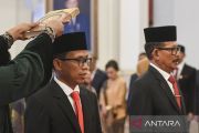 Pujiyono Suwandi (kiri) bersama Babul Khoir (kanan) mengucapkan sumpah sebagai anggota Komisi Kejaksaan di Istana Negara, Jakarta, Rabu (21/2/2024). Presiden Joko Widodo mengambil sumpah sembilan anggota Komisi Kejaksaan masa jabatan 2024-2028 yakni Pujiyono Suwadi sebagai Ketua merangkap anggota, Babul Khoir sebagai Wakil Ketua merangkap anggota, dan Muhammad Yusuf, Hefinur, Nurwinah, Dahlena, Rita Serena Kalibonso, Diah Srikanti, Nurokhman sebagai anggota. ANTARA FOTO/Hafidz Mubarak A/Spt.