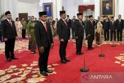 Anggota Komisi Kejaksaan mengikuti pembacaan sumpah saat pelantikan di Istana Negara, Jakarta, Rabu (21/2/2024). Presiden Joko Widodo mengambil sumpah sembilan anggota Komisi Kejaksaan masa jabatan 2024-2028 yakni Pujiyono Suwadi sebagai Ketua merangkap anggota, Babul Khoir sebagai Wakil Ketua merangkap anggota, dan Muhammad Yusuf, Hefinur, Nurwinah, Dahlena, Rita Serena Kalibonso, Diah Srikanti, Nurokhman sebagai anggota. ANTARA FOTO/Hafidz Mubarak A/Spt.