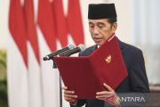 Presiden Joko Widodo mengambil sumpah anggota Komisi Kejaksaan di Istana Negara, Jakarta, Rabu (21/2/2024). Presiden mengambil sumpah sembilan anggota Komisi Kejaksaan masa jabatan 2024-2028 yakni Pujiyono Suwadi sebagai Ketua merangkap anggota, Babul Khoir sebagai Wakil Ketua merangkap anggota, dan Muhammad Yusuf, Hefinur, Nurwinah, Dahlena, Rita Serena Kalibonso, Diah Srikanti, Nurokhman sebagai anggota. ANTARA FOTO/Hafidz Mubarak A/Spt.