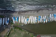 Foto udara kapal bantuan untuk nelayan saat sandar di Pantai Boe, Kecamatan Galesong, Takalar, Sulawesi Selatan, Rabu (21/2/2024). Bantuan sebanyak 30 kapal dari Bank BJB (Bank Jabar Banten) tersebut guna memaksimalkan hasil tangkapan telur ikan terbang dan meningkatkan kesejahteraan masyarakat pesisir khususnya nelayan di daerah tersebut. ANTARA FOTO/Hasrul Said/Spt.