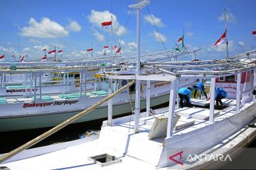 Pekerja mengecek kapal bantuan untuk nelayan di Pantai Boe, Takalar, Sulawesi Selatan, Rabu (21/2/2024).Bantuan sebanyak 30 kapal dari Bank BJB (Bank Jabar Banten) tersebut guna memaksimalkan hasil tangkapan telur ikan terbang dan meningkatkan kesejahteraan masyarakat pesisir khususnya nelayan di daerah tersebut. ANTARA FOTO/Hasrul Said/Spt.