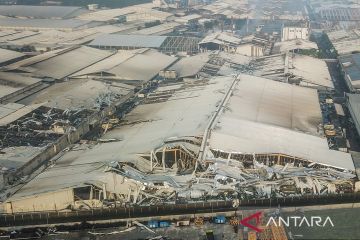 Foto udara kawasan industri yang terdampak angin puting beliung di Kabupaten Sumedang, Jawa Barat, Kamis (22/2/2024). BPBD Provinsi Jawa Barat mencatat, bencana angin puting beliung yang terjadi di Kabupaten Sumedang dan Kabupaten Bandung tersebut mengakibatkan 97 rumah dan 17 unit bangunan pabrik mengalami kerusakan, serta 413 kepala keluarga terdampak dan 31 orang dilarikan ke rumah sakit. ANTARA FOTO/Raisan Al Farisi/rwa.