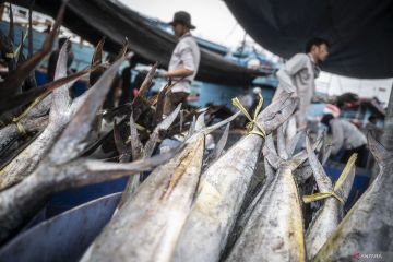 Pekerja memindahkan ikan hasil tangkapan nelayan di Pelabuhan Muara Baru, Jakarta, Jumat (23/2/2024). Kementerian Perikanan dan Kelautan (KKP) menargetkan produksi perikanan mencapai 30,85 juta ton pada 2024. ANTARA FOTO/Aprillio Akbar/foc.