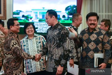 Menteri ATR/Kepala BPN Agus Harimurti Yudhoyono (kedua kanan) berjabat tangan dengan Kepala Staf Kepresidenan Moeldoko (kiri) disaksikan Menteri LHK Siti Nurbaya (kedua kiri) dan Menkopolhukam Hadi Tjahjanto jelang Sidang Kabinet Paripurna di Istana Negara, Jakarta, Senin (26/2/2024). Untuk pertama kalinya Ketua Umum Partai Demokrat Agus Harimurti Yudhoyono menghadiri Sidang Kabinet Paripurna yang dipimpin Presiden Joko Widodo setelah dirinya dilantik sebagai Menteri ATR/Kepala BPN. ANTARA FOTO/Sigid Kurniawan/aww.