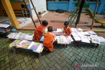 Tiga siswa menjemur buku yang basah akibat kehujanan di sekolah kawasan Sumput, Sidoarjo, Jawa Timur, Selasa (27/2/2024). Empat ruang kelas di sekolah itu rusak akibat hujan deras dan angin kencang pada Senin (26/2) sore. ANTARA FOTO/Umarul Faruq/wpa.