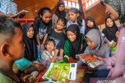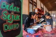 Anak-anak Suku Duano dan pesisir Kampung Laut membaca buku di ruang Sekretariat Komunitas Literasi Bedak Sejuk Duano, Kuala Jambi, Tanjung Jabung Timur, Jambi, Jumat (1/3/2024). Kegiatan rutin yang telah dilakukan sejak tujuh bulan terakhir yang diinisiasi oleh beberapa pemuda pesisir setempat dari Komunitas Bedak Sejuk Duano itu bertujuan meningkatkan kemampuan literasi anak-anak Suku Duano dan pesisir daerah itu yang umumnya berasal dari keluarga nelayan. ANTARA FOTO/Wahdi Septiawan/aww.