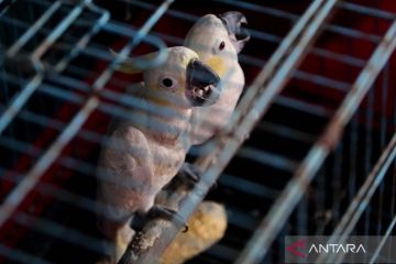 Barang bukti burung kakatua jambul kuning (Cacatua sulphurea) berada di dalam kandang saat ungkap kasus perdagangan satwa dilindungi di Polda Jawa Timur, Surabaya, Jawa Timur, Kamis (7/3/2024). Aparat Polda Jatim menangkap dua tersangka berinisial MIH dan MKP atas kasus dugaan memperdagangkan satwa dilindungi dan mengamankan dua ekor burung kakatua jambul kuning (Cacatua sulphurea), seekor burung tiong emas (Gracula religiosa), dan 1.354 ekor labi-labi moncong babi (Carettochelys insculpta). ANTARA FOTO/Didik Suhartono/aww.