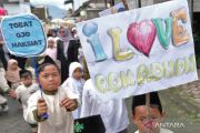 Sejumlah santri madrasah diniyah mengikuti pawai taaruf sambut Ramadhan di Muntung, Candiroto, Jawa Tengah, Minggu (10/3/2024). Pawai taaruf yang diikuti oleh ratusan santri tersebut sebagai ungkapan sukacita menyambut datangnya bulan suci Ramadhan 1445 Hijriah sekaligus mengajak umat Islam untuk meningkatkan amal ibadah. ANTARA FOTO/Anis Efizudin/YU