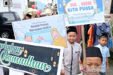 Anak-anak mengikuti pawai semarak Ramadhan di kawasan Kampung Bali, Tanah Abang, Jakarta, Sabtu (9/3/2024). Pawai yang diikuti ratusan warga Kampung Bali tersebut dalam rangka menyambut bulan suci Ramadhan 1445 Hijriah. ANTARA FOTO/Sulthony Hasanuddin/YU